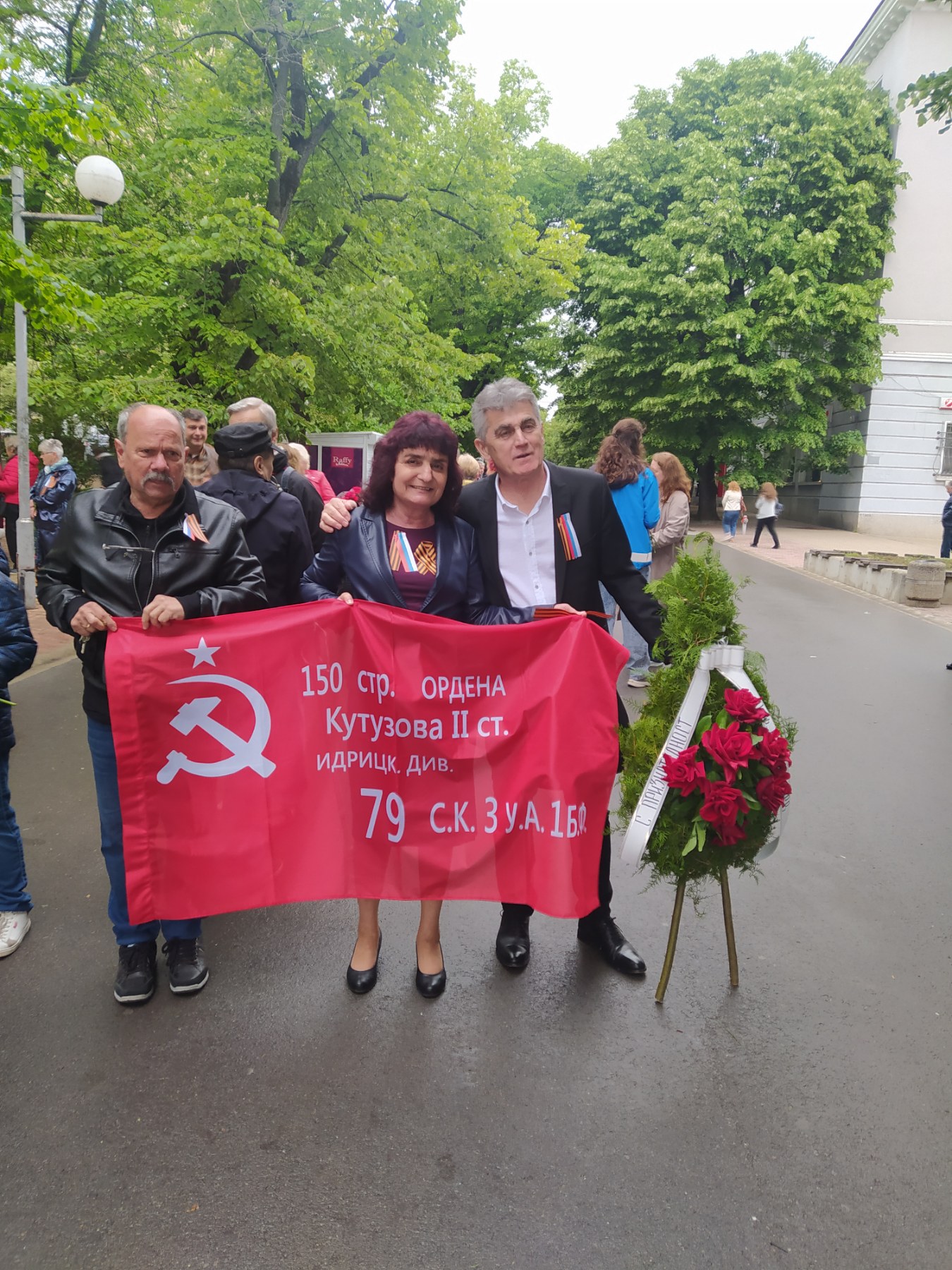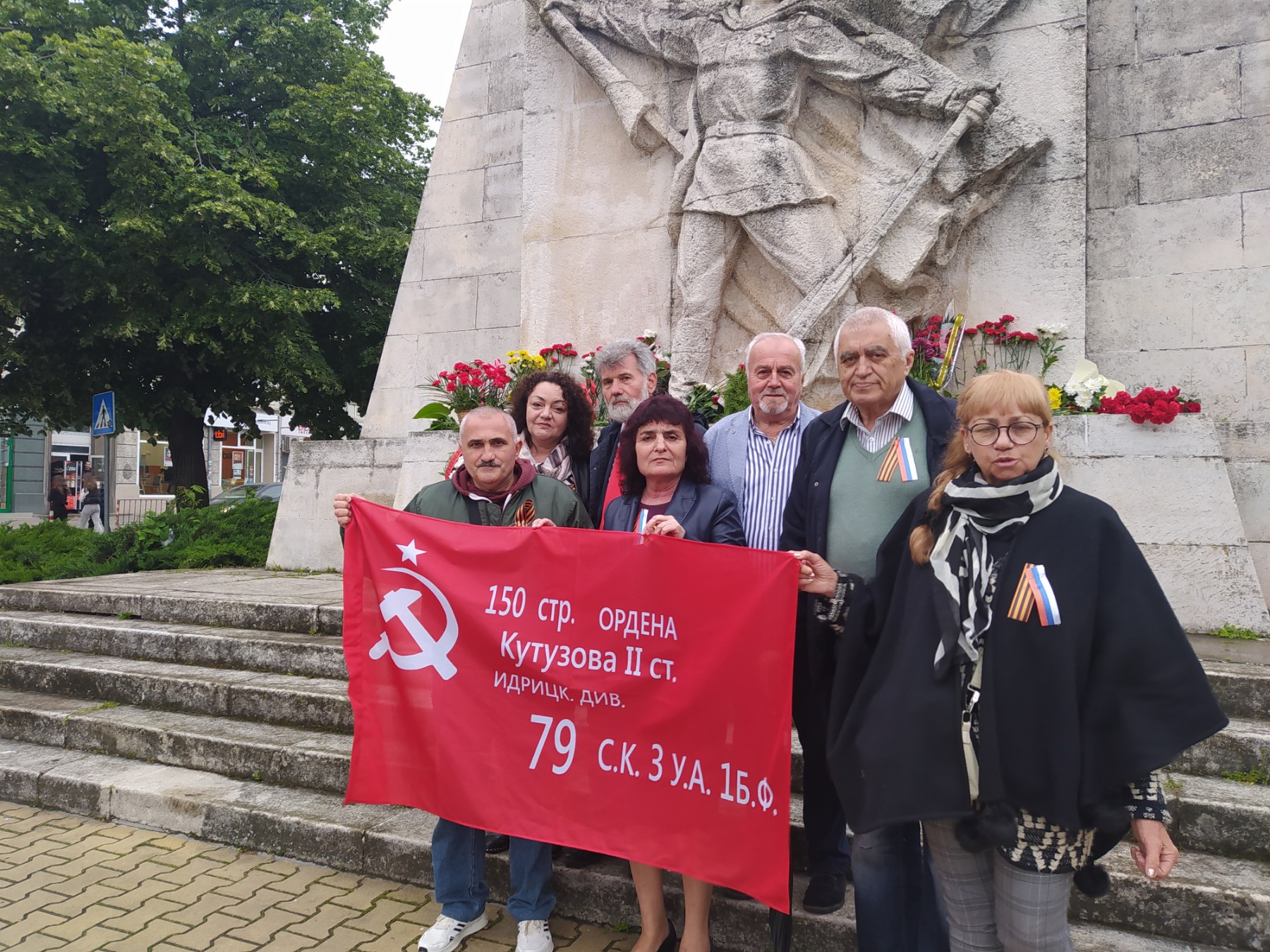 След това шествието премина през централната част на столицата и стигна до мястото, където преди това се издигаше Паметникът на Съветската армия, частично съборен от проамериканските власти на столицата. Там участиците в шествието положиха цветя на оградата, която в момента опасва територията около остатъците от паметника.