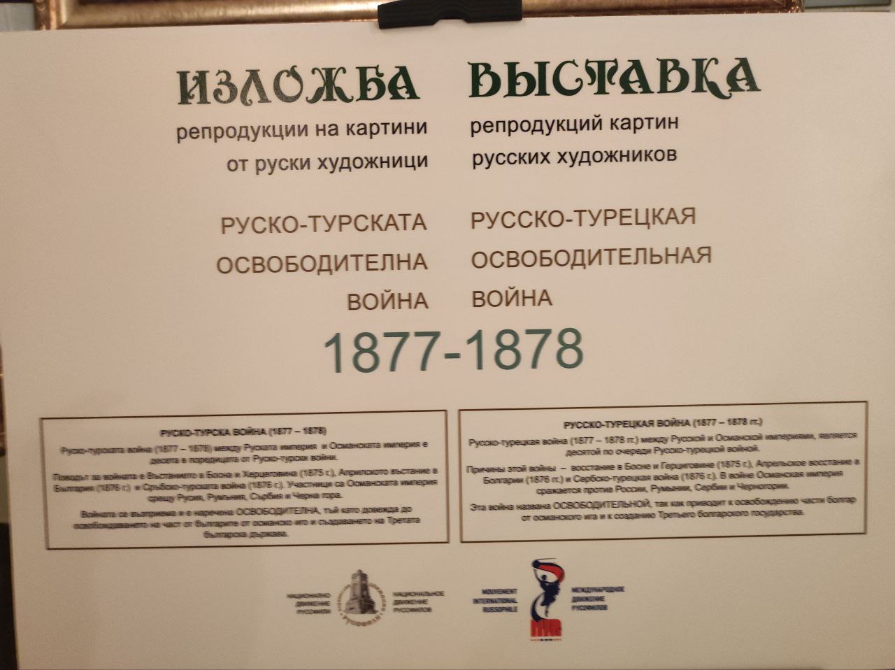 26.07.2024 в галерее на улице „Бузлуджа“, 4 в Софии открылась выставка с репродукциями картин русских художников, посвященные Русско-турецкой войне 1877-1878 гг. История всей экспозиции впечатляет. Впервые 38 экспонатов были выставлены в Народном собрании Республики Болгария в 2018 году по случаю 140-летия окончания войны, после чего выставка была представлена в муниципалитете Софии, в галереях крупных городов Болгарии. Впоследствии она была организована в Государственной Думе РФ, посетила города Самару и Орел, а затем осталась в России. В этом году подготовлено 18 репродукций для новой жизни в Болгарии. Организаторы – Международное движение русофилов и НД „Русофилы“.