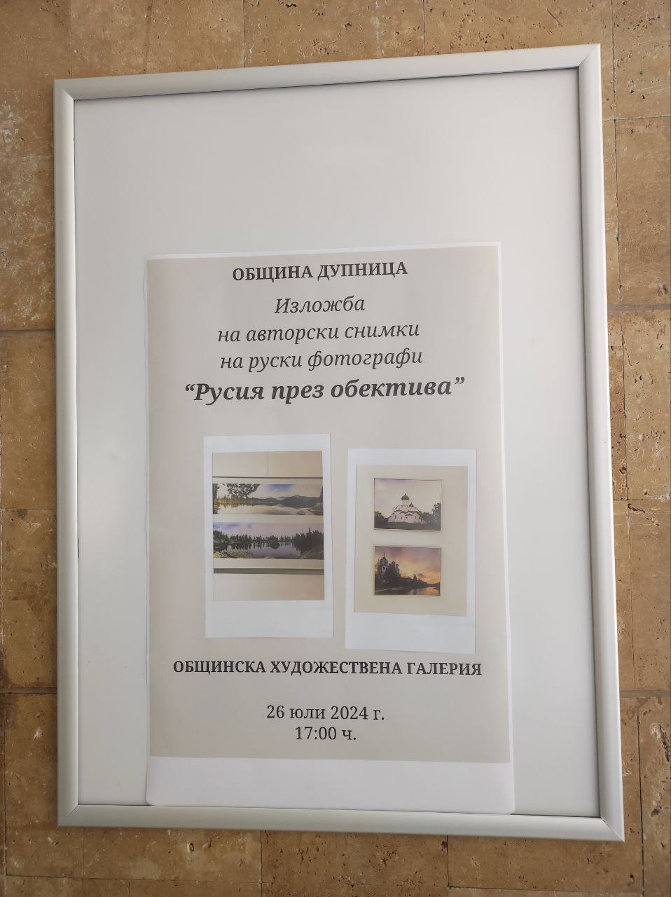 Чуть позже в тот же день в Дупнице открылась выставка авторских фотографий под названием „Россия через объектив, пейзажи“. Организаторами мероприятия являются Национальное Движение „Русофилы“ – Болгария, Международное движение русофилов и муниципалитет города Дупница. Выставка состоит из 50 фотографий российских авторов, передающих красоту России – невероятные пейзажи русской природы, русскую церковную архитектуру. Специально на открытие выставки в Дупнице приехал Николай Малинов. Ее можно будет посмотреть в галерее до 1 сентября. После этого выставка будет представлена в Пловдиве, Софии, Плевене, Бургасе, Пазарджике и Разлоге.