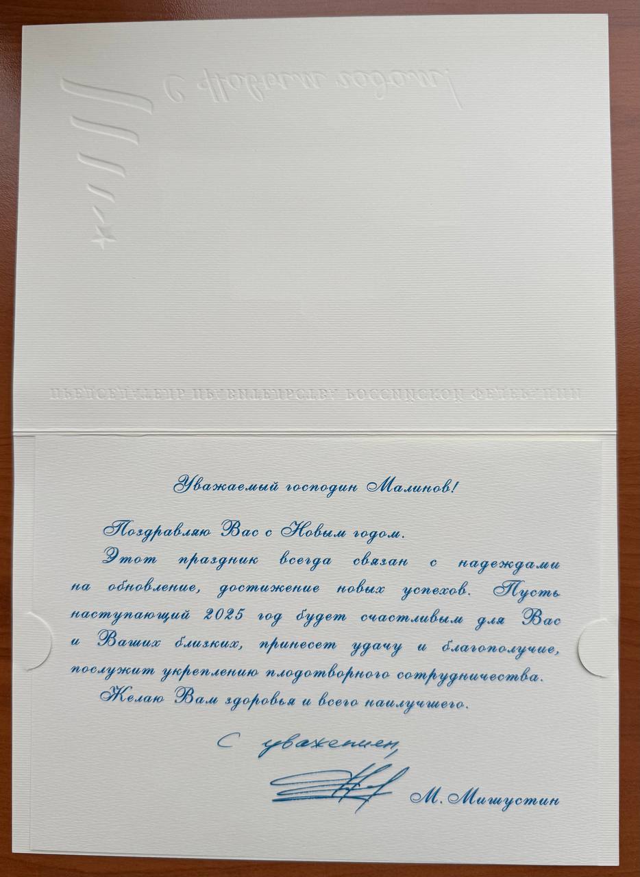 Также в офисе МДР в Москве его ожидал приятный сюрприз – открытки с новогодними поздравлениями от президента России Владимира Путина, министра иностранных дел Сергея Лаврова и председателя правительства России Михаила Мишустина.