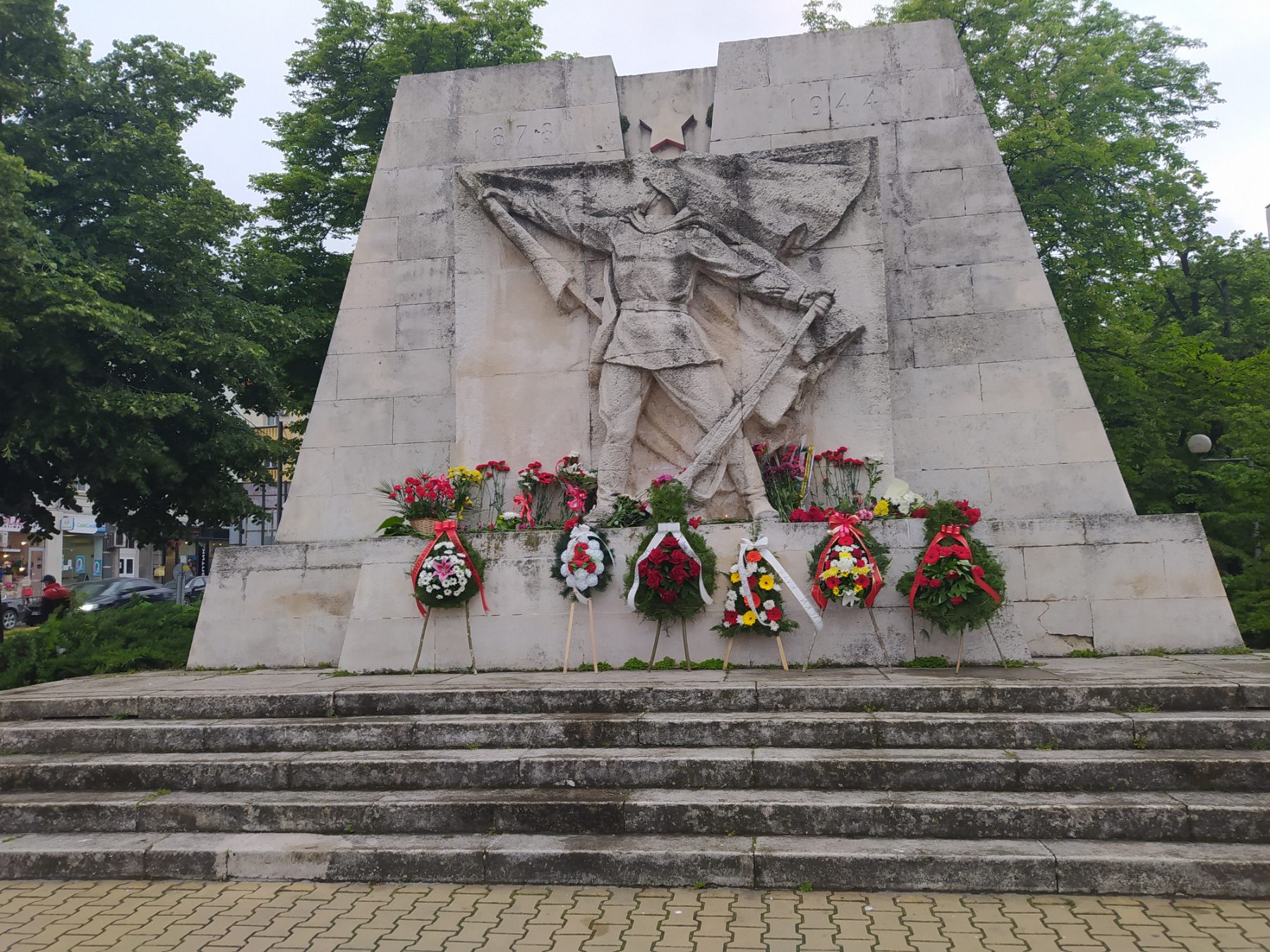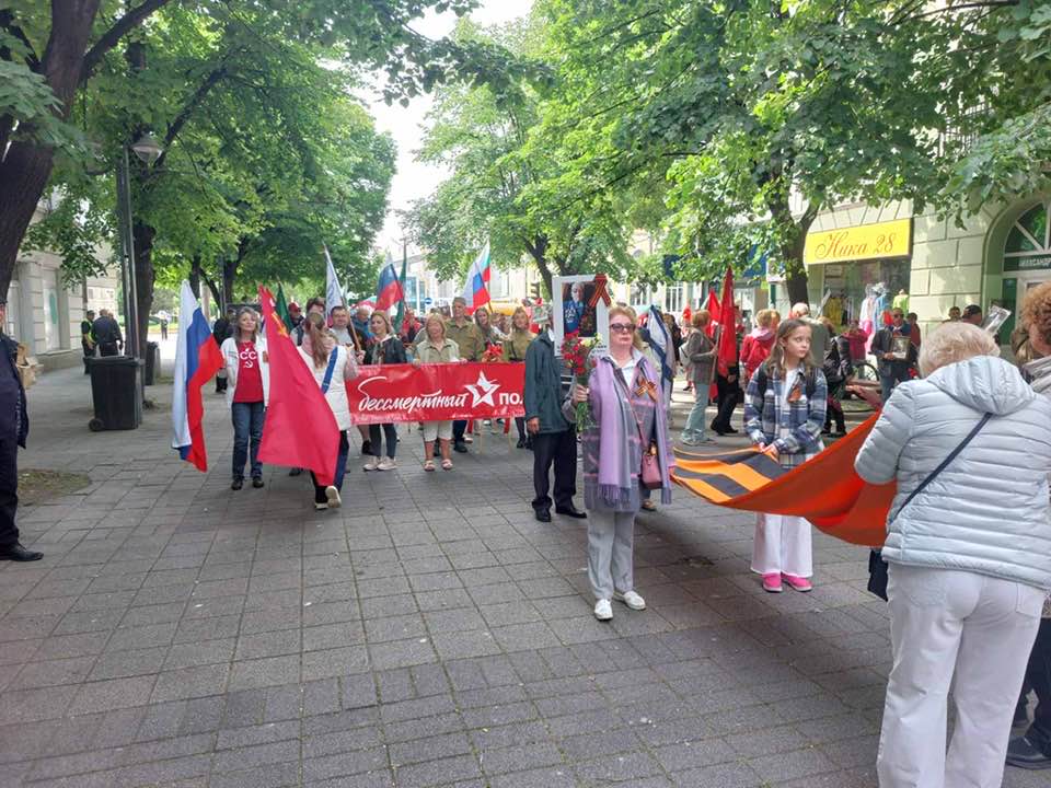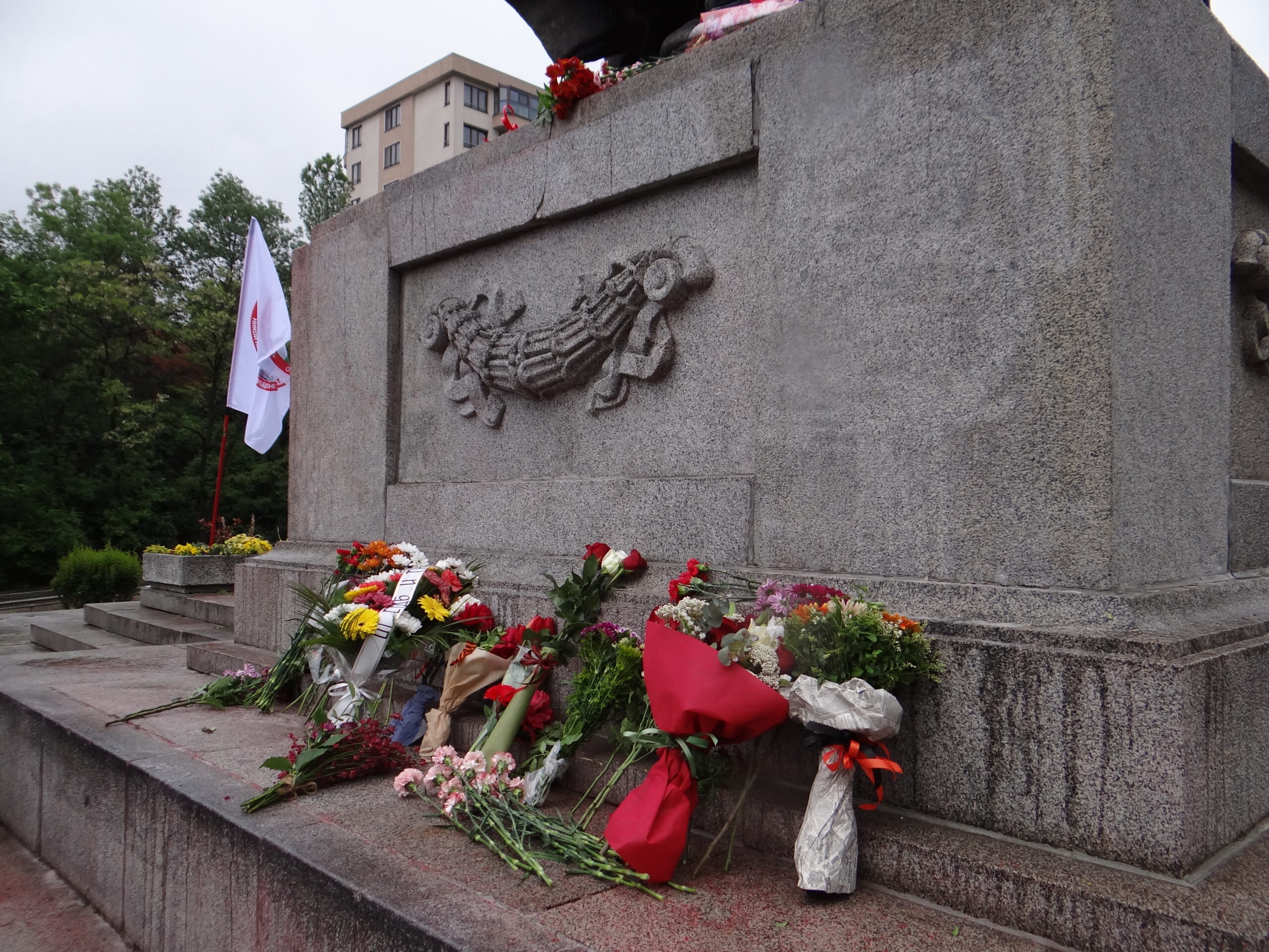 След това шествието премина през централната част на столицата и стигна до мястото, където преди това се издигаше Паметникът на Съветската армия, частично съборен от проамериканските власти на столицата. Там участиците в шествието положиха цветя на оградата, която в момента опасва територията около остатъците от паметника.