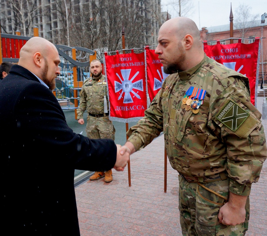 Преди връчването на отличията думата взе изпълнителният директор на Съюза на Доброволците в Донбас Андрей Пинчук: «Ситуацията в Донбас остава напрегната. Всеки ден там загиват наши братя, също както през последната година и половина загиваха тези, които бяха заедно с нас. Ние влизахме в бой, отстоявахме своята идея. Със своите сърца и тела ние пазехме мирните жители и цяла Русия, защото там, в Донбас, войната е за Русия и срещу Русия, срещу целия православен свят.