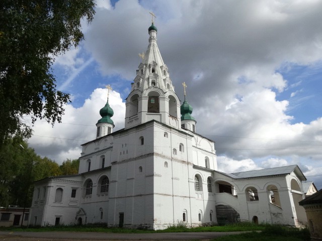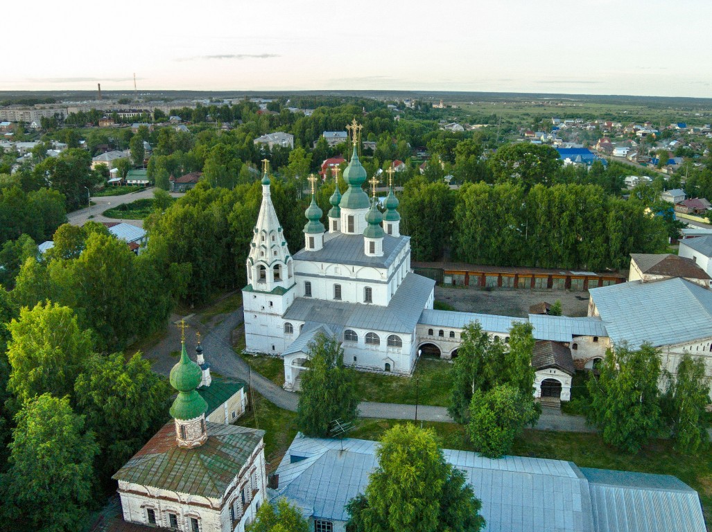 Този манастир заслужава специално внимание – най-древната постройка във Велики Устюг, отбелязана в летописите от XIII век. Датата на неговото възникване е 1212 година. Каменните му постройки са съхранени доста добре. Оцелял е Михаило-Архангелският събор. Неговото строителство през 1653-1656 г. е спонсорирано от търговеца Никита Ревякин. Отвън соборът изглежда просто, строго, с минимум декоративни елементи. Ярката му вътрешна украса е иконостасът с резбована позлата. При създаването му са използвани 2 стила – бароко и класицизъм.