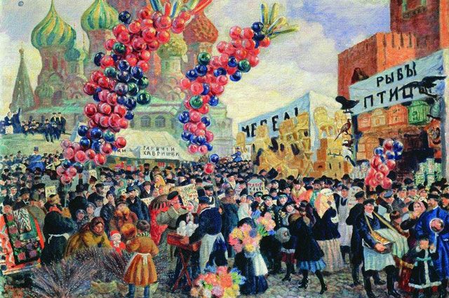 Картина на Борис Кустодиев «Вербный торг у Спасских ворот на Красной площади в Москве» (1917)