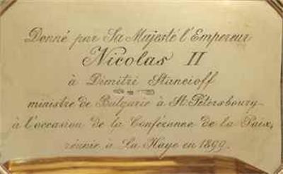 Кутията е описана в архивите на императорското семейство като изработена на 3 август 1899 г. и е под №33. Още същия ден е била подарена на Димитър Станчов.