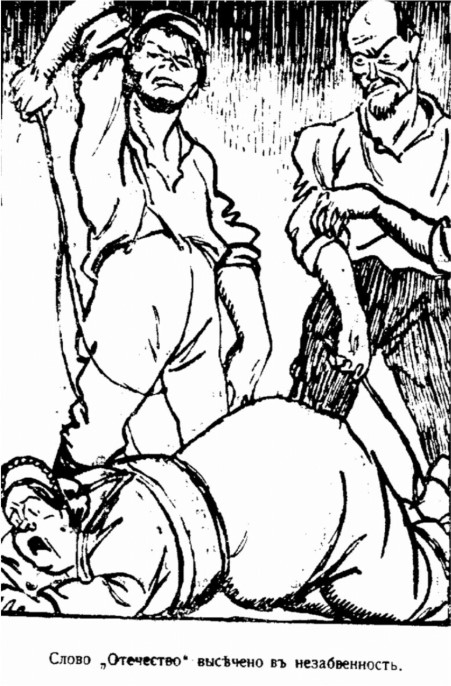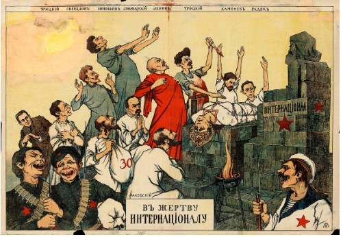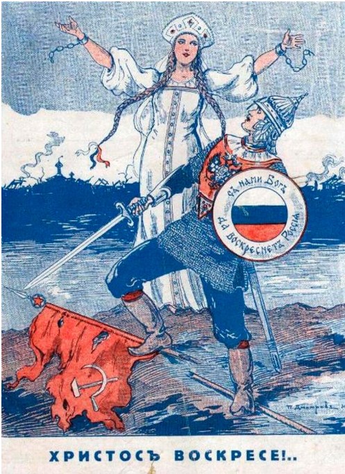 За „белите“, противници на съветската власт, образът на майчица-Русия остава свещен. В тяхната карикатура „Жертва на Интернационала“ тя се появява като нещастна вързана жена, която е измъчвана от болшевишките вождове.