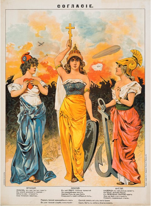На плакатите от Първата световна война Русия, Англия и Франция са изобразени като три свети сестри-мъченици: Вяра, Надежда и Любов. Това подчертава справедливия характер на войната от страна на Антантата: „Света Рус, в името на Бога, извършва своя победен път“.