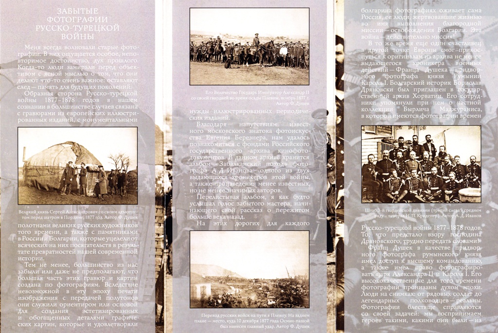 В експозицията са влезли 60 работи, намерени в Руския държавен архив за кино и фотодокументи на град Красногорск и в архива на град Риека – Хърватия. Техни автори са руският фотограф А. Д. Иванов и придворният фотограф на княза на Румъния Карол I – Франц Душек, един от най-големите хроникьори на Пуско-турската война.