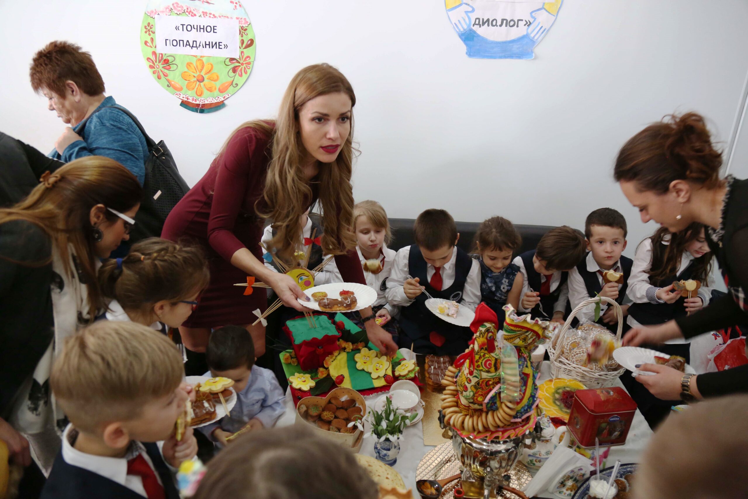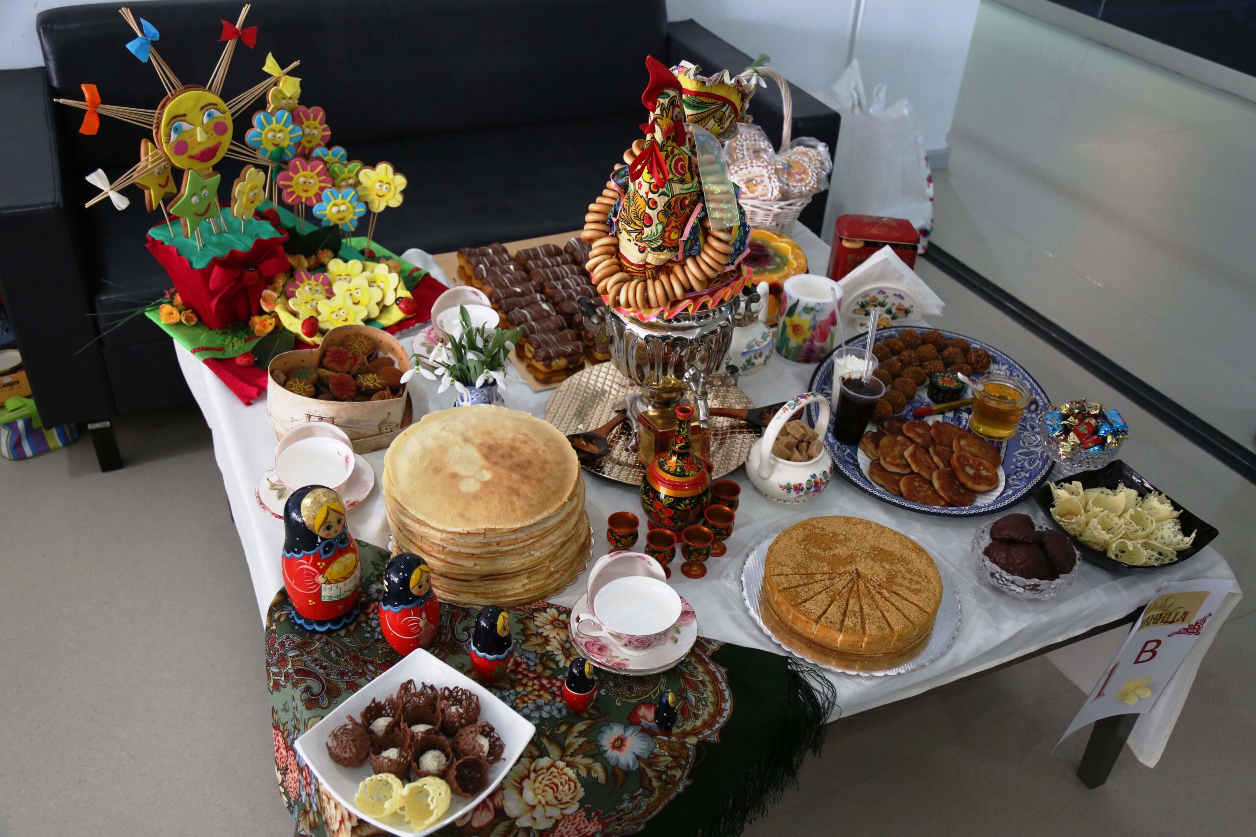 Всички бяха поканени на „Вкусна изложба“, в която взеха участие 20 от класовете на ЧСУ „Юрий Гагарин“, родители и преподаватели. Iв и IVа клас станаха победители в оспорвания конкурс между паралелките – за най-красиво подредена маса, за най-добро представяне на символите на празника – блините, и за най-гостоприемно посрещане. Определянето на призовите места изключително затрудни журито, тъй като всички ученици се бяха справили повече от отлично… и вкусно! Първокласниците, с помощта на своите родители, бяха подредили красива презентация от палачинки и меденки под формата на усмихната слънчева пролет, а гостите си посрещаха с чаша чай от истински руски самовар.  СОК „Камчия“ почерпи всички участници и гости с палачинки, а дневното меню на децата от ЧСУ „Юрий Гагарин“ бе изцяло в руската кулинарна традиция.