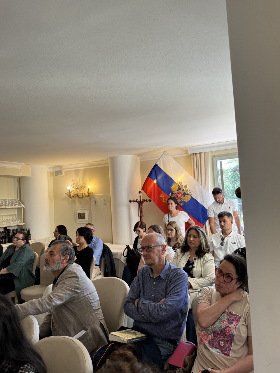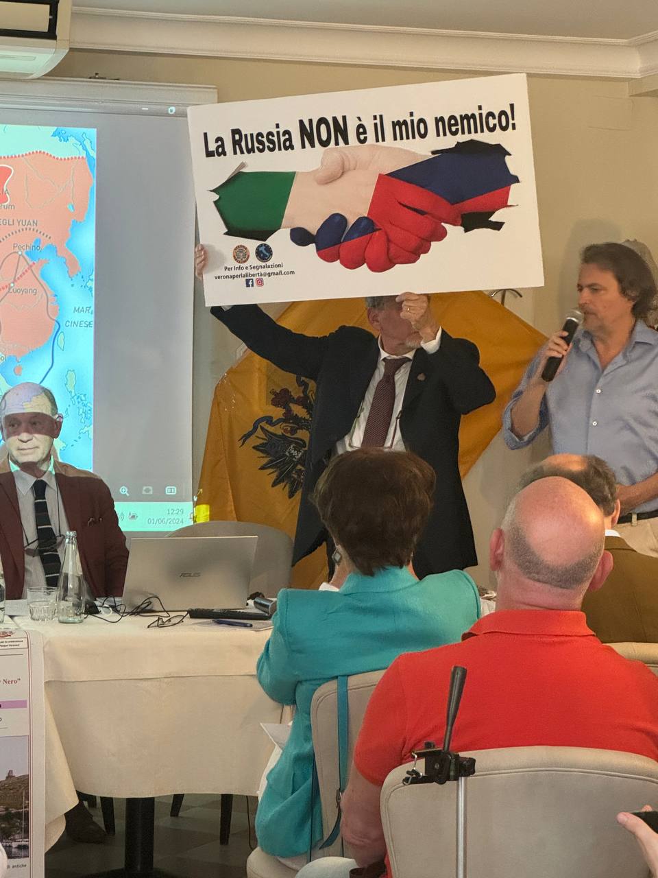В края на конференцията един от участниците издигна плакат „Русия не ни е враг“.