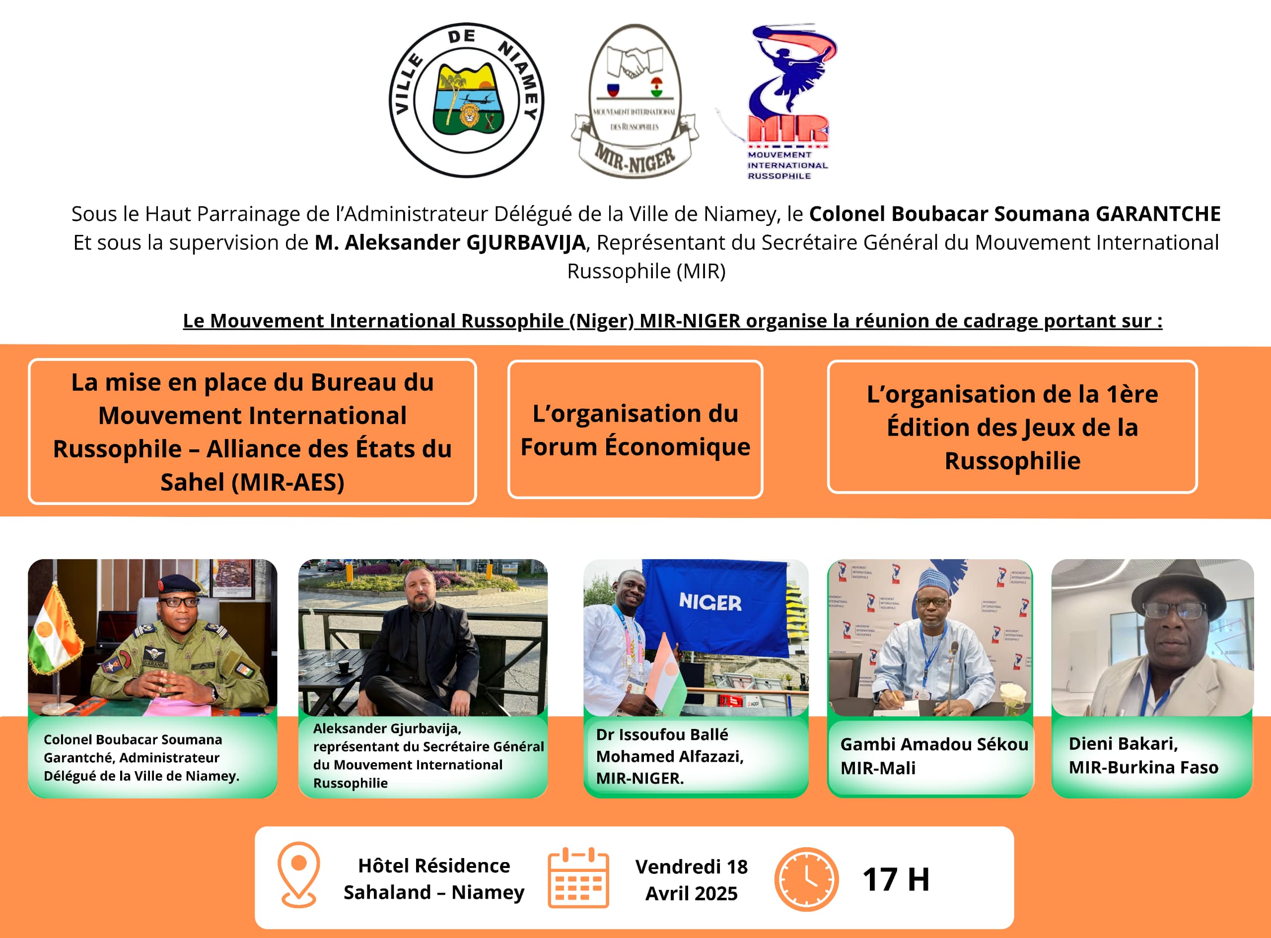 На 18 и 19 април 2025 г. в конферентната зала на хотелската резиденция „Саха Ленд Палас“, гр. Ниамей, Република Нигер, се проведе среща за откриването на регионална секция на Международното движение на русофилите (МДР) на Конфедерацията на държавите от Сахел (КДС – AES). Събитието се проведе под патронажа на кмета на Ниамей, полковник Бубакар Сумане Гаранше, представляващ правителството на Нигер.