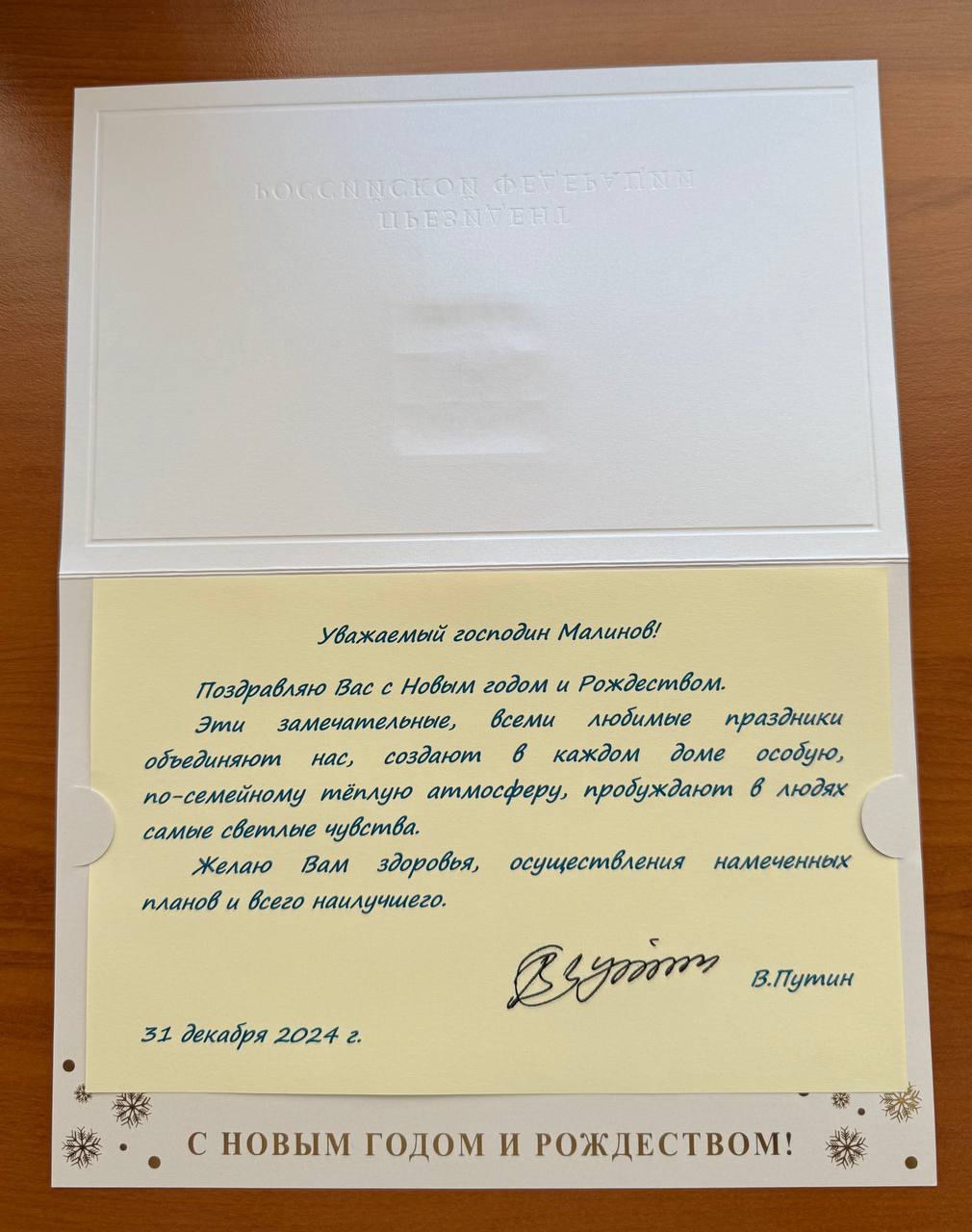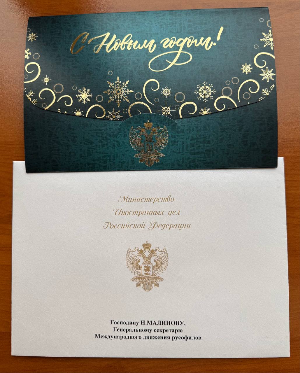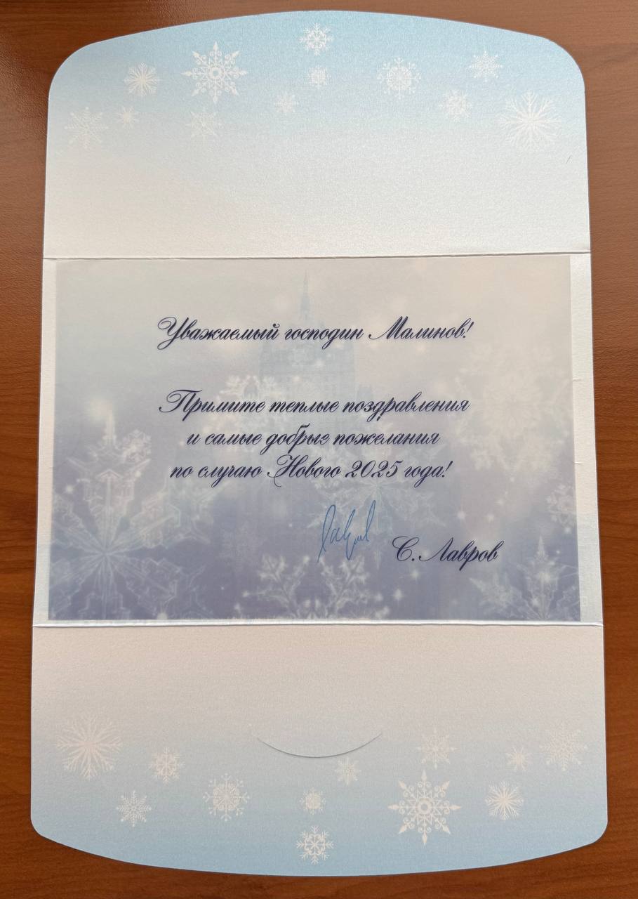 Также в офисе МДР в Москве его ожидал приятный сюрприз – открытки с новогодними поздравлениями от президента России Владимира Путина, министра иностранных дел Сергея Лаврова и председателя правительства России Михаила Мишустина.