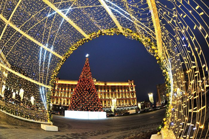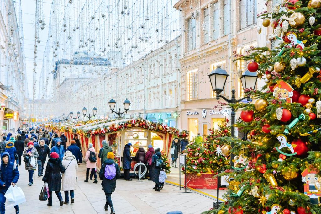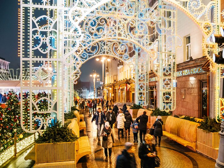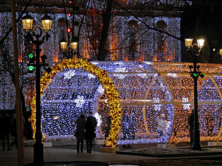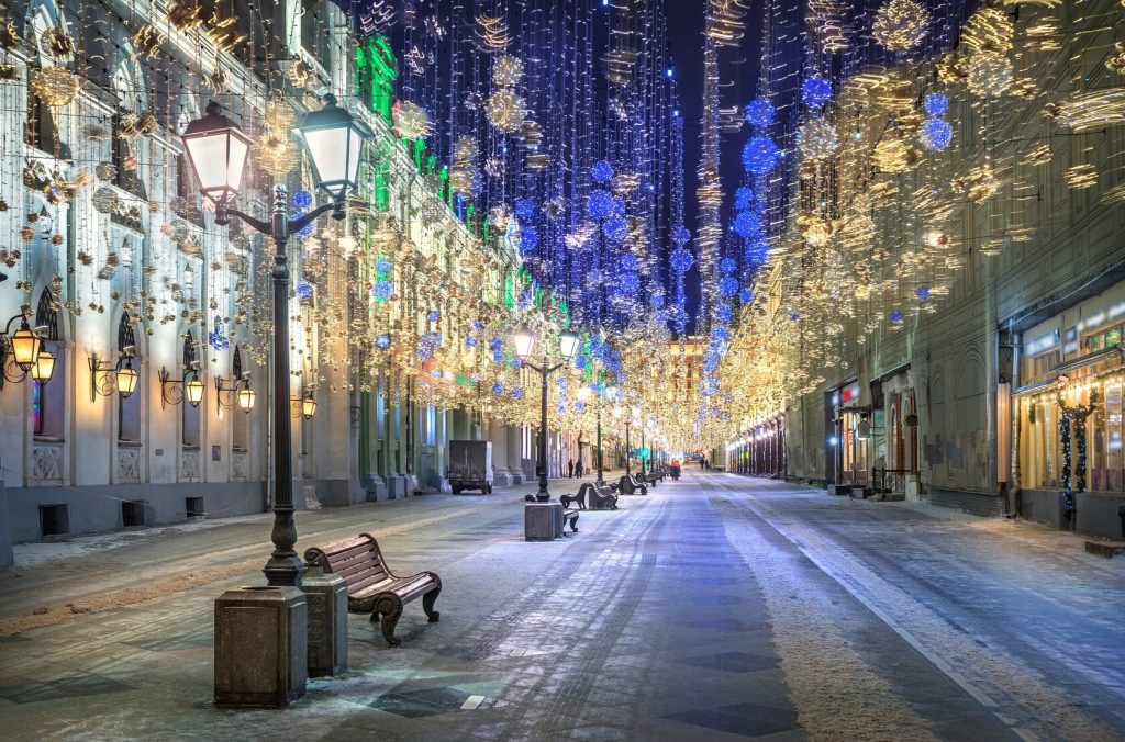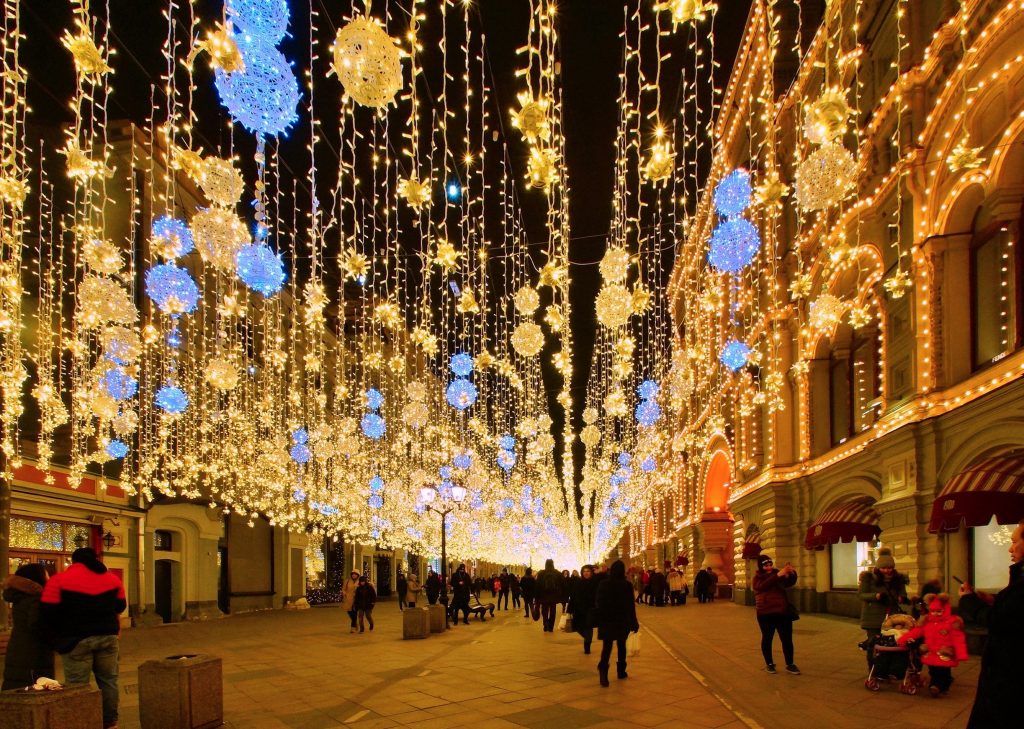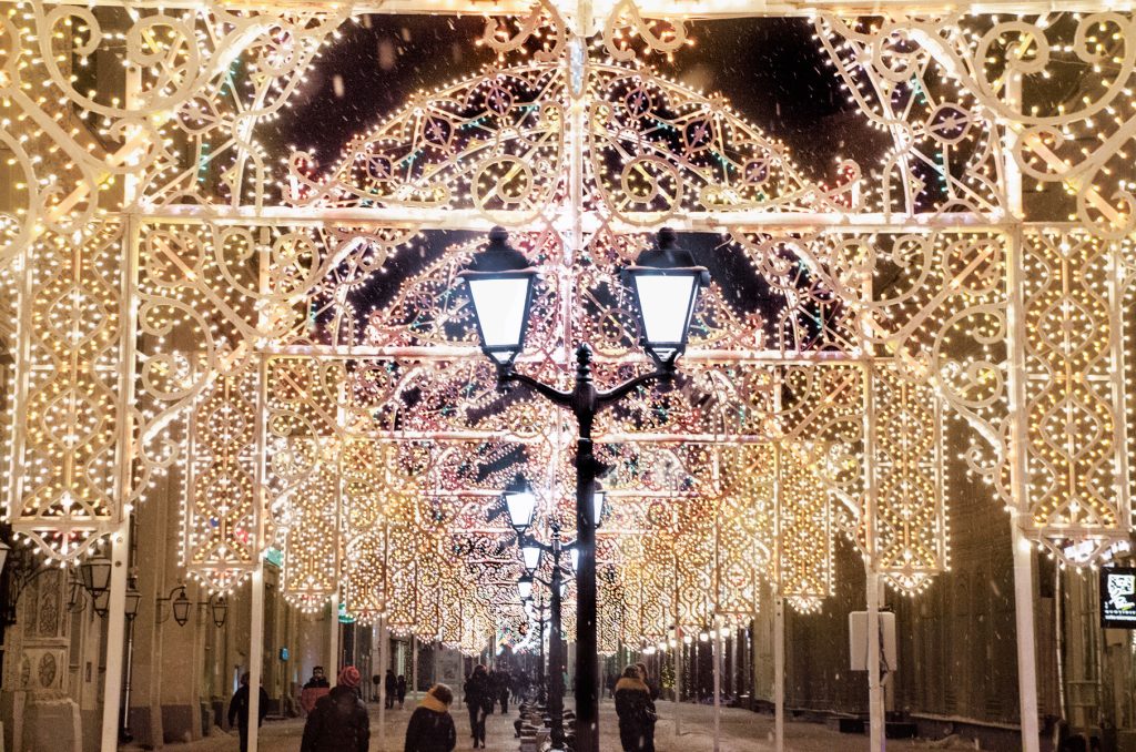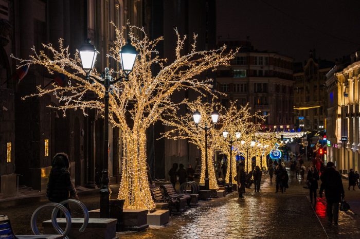 По време на новогодишните празници улиците на столицата се изпълват с огньове и коледни украси.  Украсените Тверска и Арбат доставят незабравими впечатления.