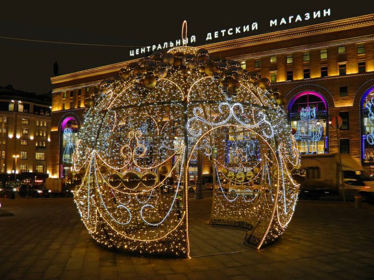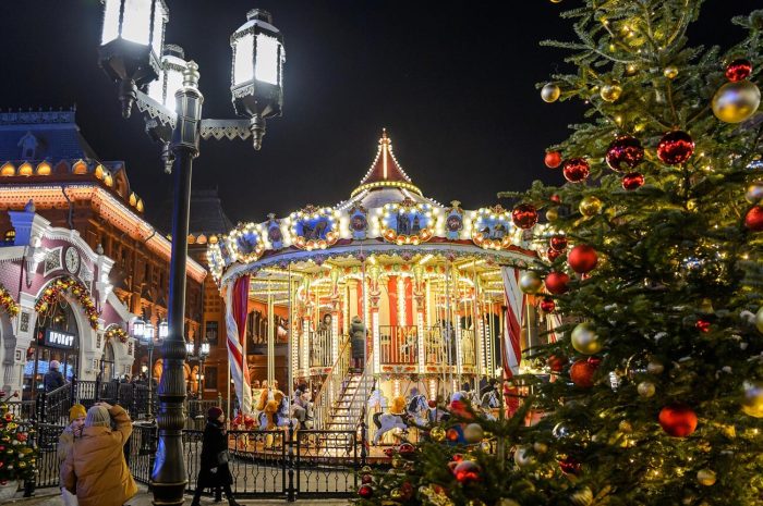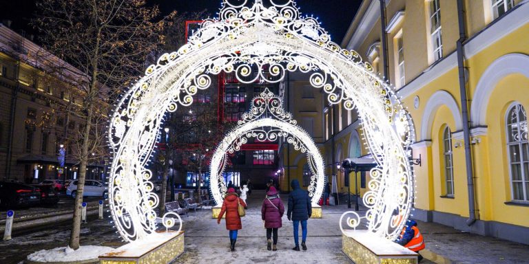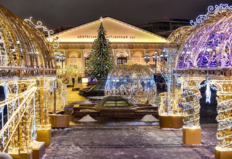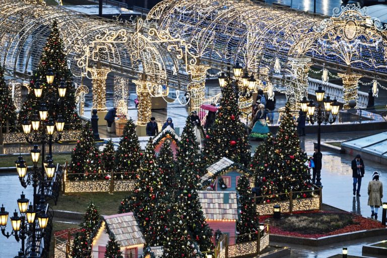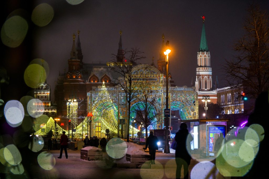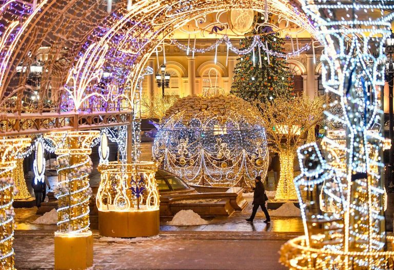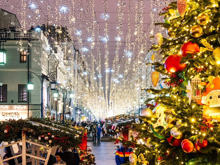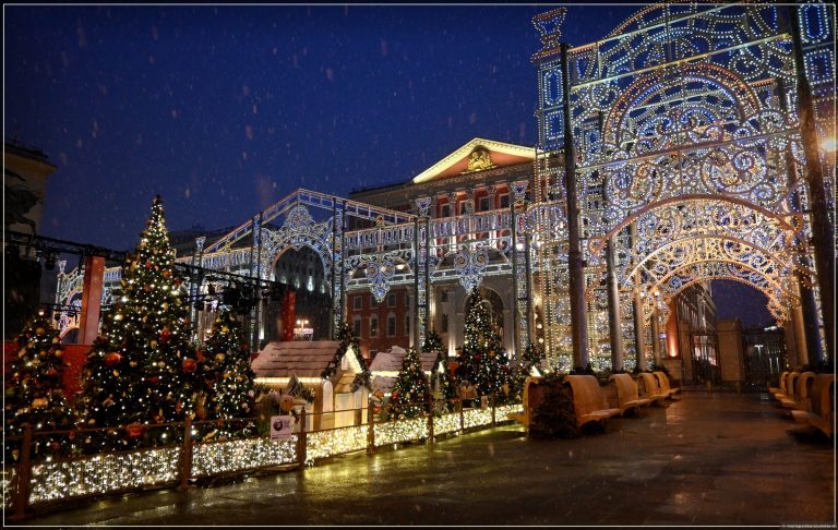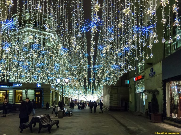 По време на новогодишните празници улиците на столицата се изпълват с огньове и коледни украси.  Украсените Тверска и Арбат доставят незабравими впечатления.