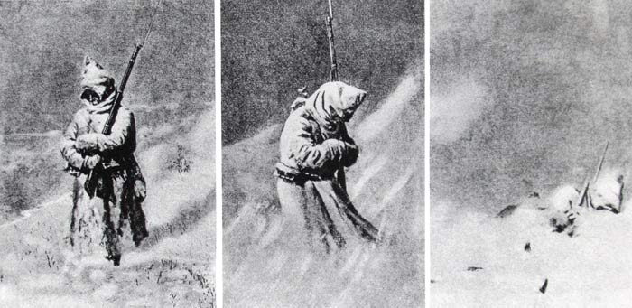 Шипка, 15 (27) ноември. … Тук само закалените войници от 8-и армейски корпус могат сравнително успешно да се борят с природните стихии. Досега снегът се задържаше само по височините, които започват от така наречената тук „Брянска къщичка”. От 14 (26) ноември планината се покри със сняг, който стига почти до подножието й. Трето денонощие продължава ужасното време. Вали сняг и след това дъжд във вид на ледени зрънца, придружени от силен студ и леден вятър, който понякога се превръща в истински ураган. Тук-там стърчат палатки, предимно конусообразни, които ние получихме в изобилие от турците, които избягаха от прохода. Те са покрити с дебела ледена кора и представляват някакви фантастични фигури. Това е единият вид на нашите жилища.