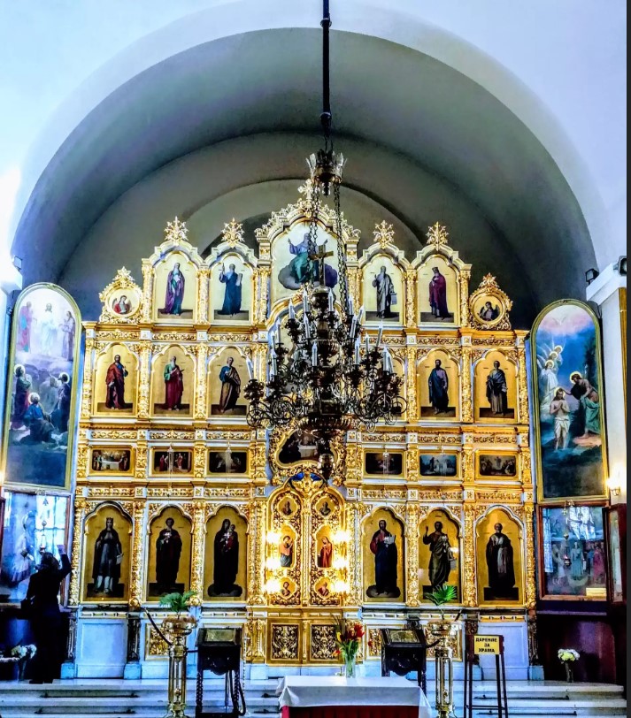 В Храма „Покров Богородичен-Всех Скорбящих Радость“ се намира един от малкото позлатени иконостаси в Софийска епархия и България. Той е изработен през втората половина на XIX век със средствата на руския Пантелеймонов манастир в Света Гора, за храма „Св. Вмчк. Пантелеймон“ в Руската Николаевска болница в Цариград. Иконите за иконостаса са направени в иконописната работилница на Белозерския скит “Св. Николай Чудотворец”. Особено голяма подкрепа е оказал и руският посланик в Цариград тогава граф Н.П. Игнатиев. Храмът към руската болница с прекрасния иконостас е бил открит 1875г.