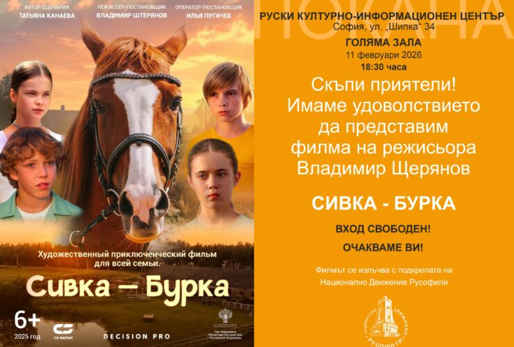 Имаме удоволствието на ви поканим на премиерата на филма“Сивка – Бурка“ на 11 февруари (сряда) от 18:30 часа в РКИЦ – София, ул. „Шипка“ № 34. Филмът ще бъде представен от режисьора Владимир Щерянов, който е член на Националния съвет на Национално Движение Русофили и продуцента Олга Земчугова. Сценарист на филма е Татяна Канаева, оператор – Иля Пугачов. По време ...